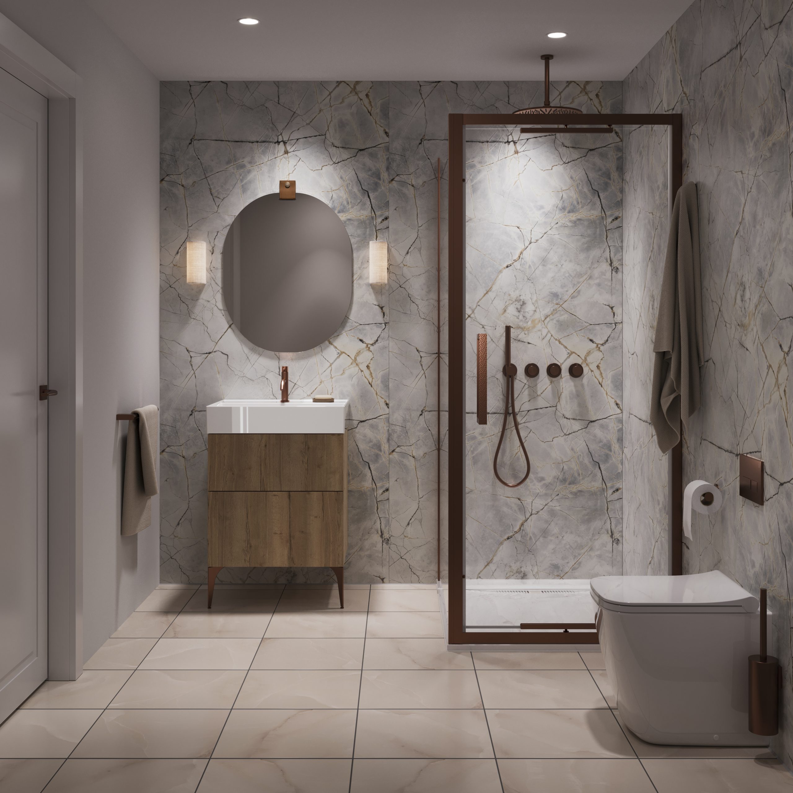 Striking and luxurious, Roma Marble features a cool grey-blue base with bold veining in gold, amber, and charcoal. Full of movement and contrast, it’s ideal for sophisticated statement spaces—balancing classic opulence with a contemporary edge.