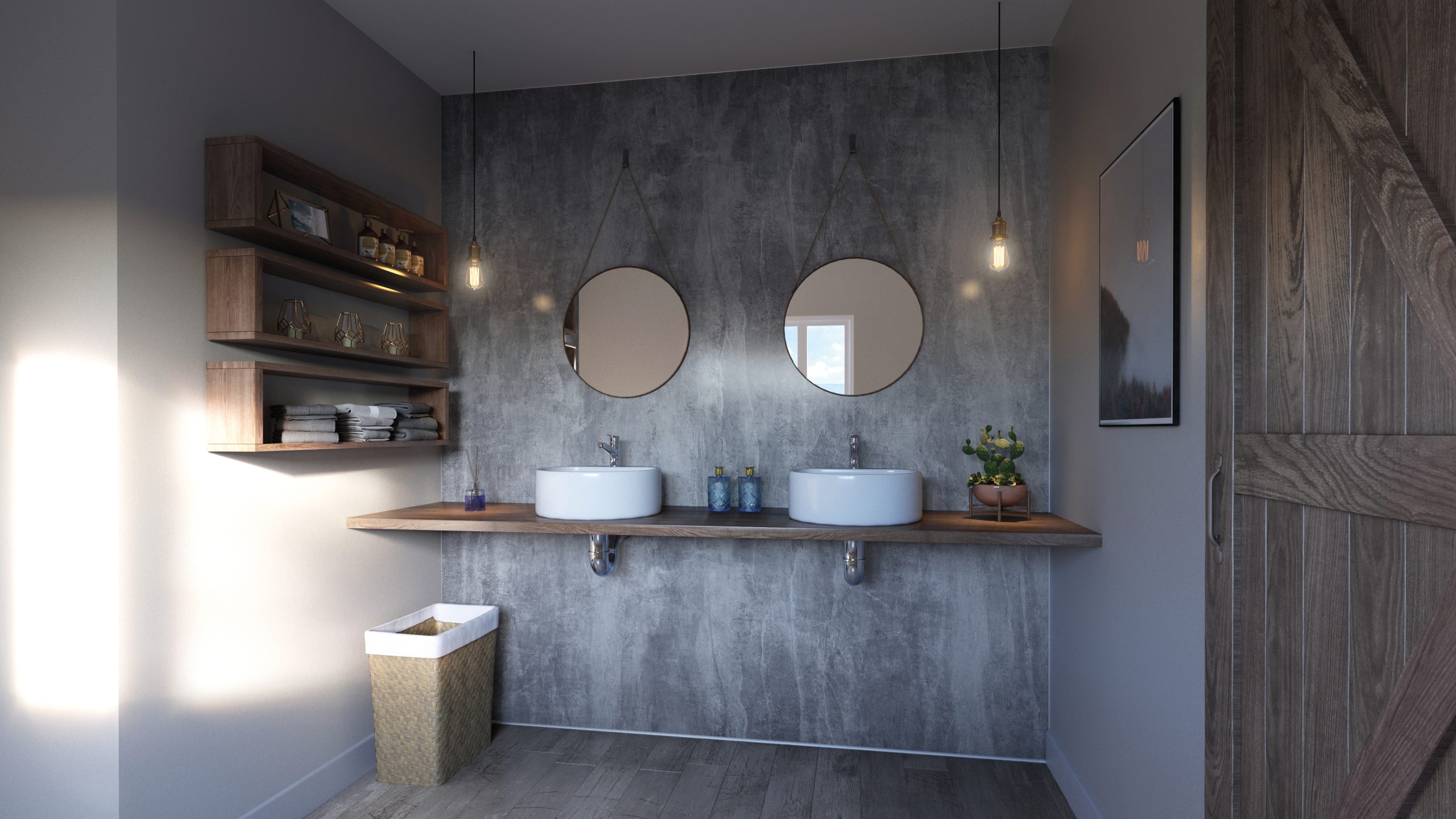 An understated, versatile contemporary décor that brings exterior-inspired looks into bathroom interiors. Style it with warm natural elements like wood-effect flooring, potted plants, and fresh flowers to complete the space.